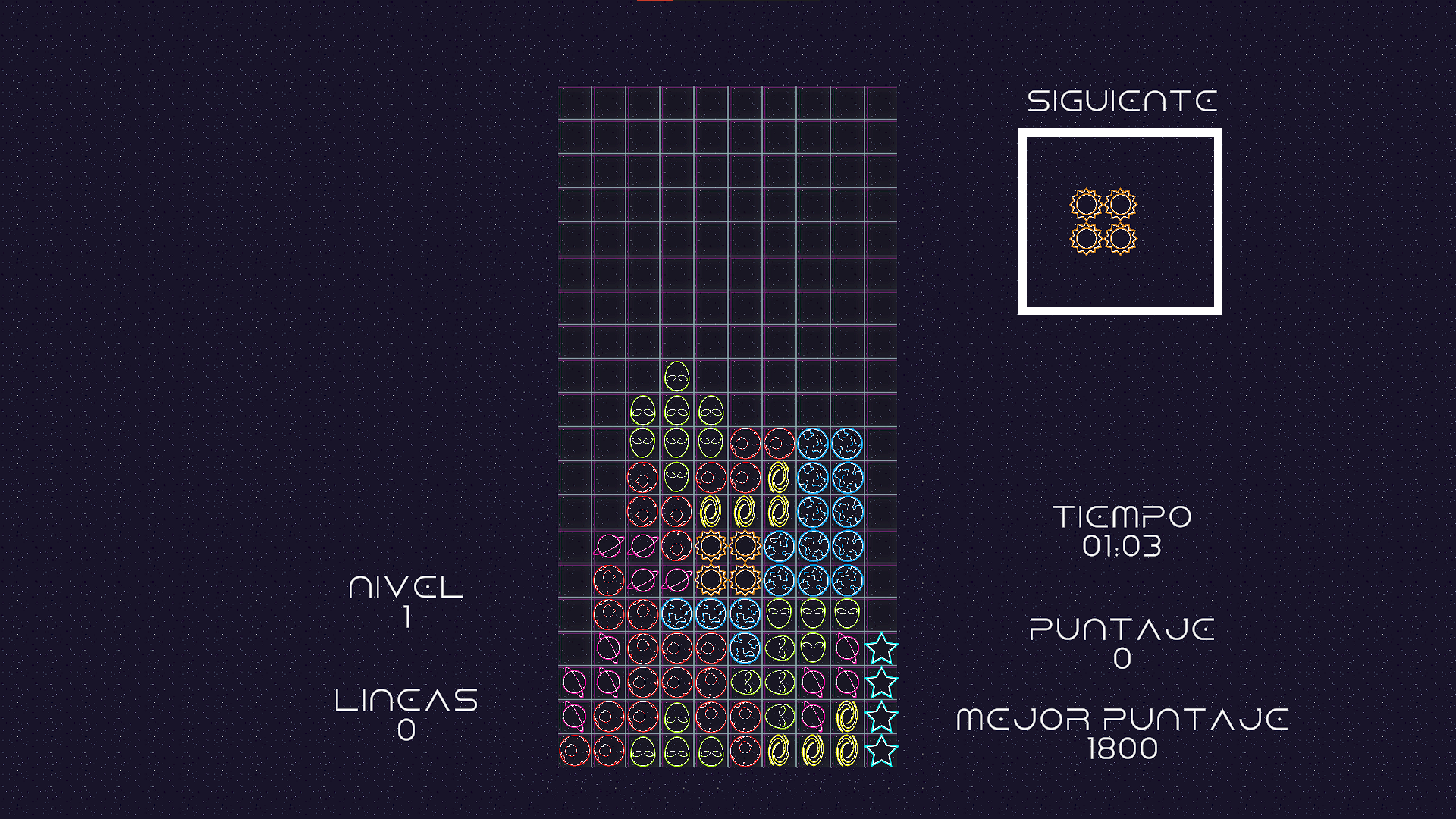 Juego puzzle sencillo y divertido. ¡Coloca los planetas, estrellas y otros elementos cósmicos y elimina líneas completas para acumular puntos!